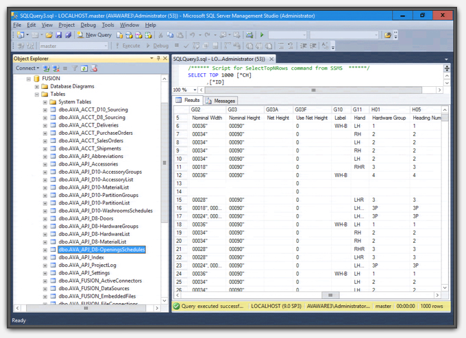SQL Server Management Studio showing the AVAproject Openings Schedules table as it exists within the SQL data.