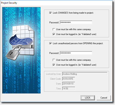 In addition to a password that can be individually established for each project file, there are two additional security checks than can be put in place.
