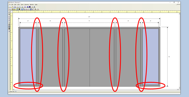 Note: The "zero-faced" mullions also provide dimension nodes that can be used to add dimension above, below and on the doors themselves.
