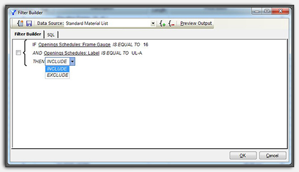 Simply select any column from the AVAproject library along with an operator and the value to compare it against. Comparisons can even be made against other columns. Since the data is being drawn from the entire Combined Information Pool, selections can be made based on data from any worksheet contained in the project. For example, rows from the Material List can be selected based on the contents of data in the Openings Schedule.