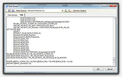 In Database terminology this is known as a “relational query” – a very complex operation that Fusion makes simple work of for non-programmers. While the selection query is built by essentially pointing and selecting, Fusion does all the difficult programming work in the background. If you happen to be interested in seeing exactly what’s going on behind the scenes, you can click on the “SQL” tab in the Filter Builder to reveal the complex SQL language command that is being composed.