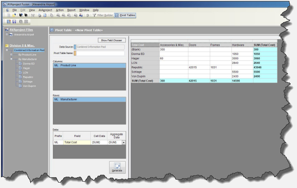 costs for each manufacturer by product, this could be achieved in seconds using the Fusion Pivot Table Builder. Simply drag the “Manufacturer” field in the “Row” box and the “Product Line” field in the “Column” box. In order to report on total costs, drag the “Total Cost” field into “Data” box. Upon clicking on “Generate”, a detailed pivot table (similar to the one below” is generated.