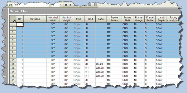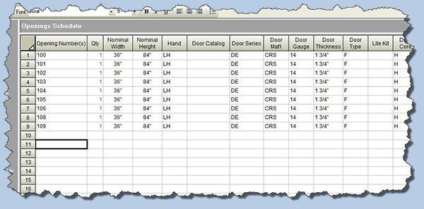 A second AVAproject Openings Schedule with a different column layout after rows have been pasted
