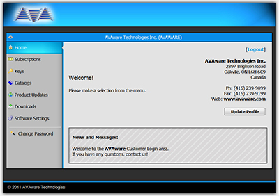 The AVAware.com Customer Login Area Home Screen