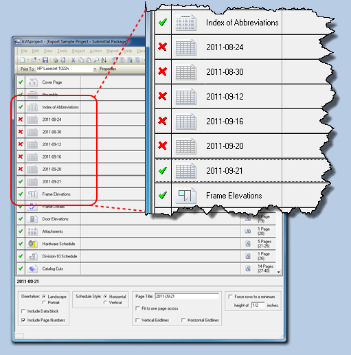 Generating Submittal Packages for a single given Openings Schedule is an even simpler process. When the Submittal is generated, each individual Openings Schedule is listed as a separate component of the entire document. To eliminate the past editions, simple click on the green check marks ( ); they will be replaced by red ( ). AVAproject will not only suppress the printing of those schedules, but any data drawn from them will be omitted from the rest of the package (i.e. elevations, profiles, hardware, etc.). De-selecting an Openings Schedule makes its entire contents essentially non-existent; even abbreviations unique to that schedule are omitted in the Index of Abbreviations page.