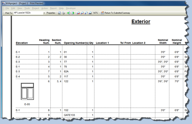 A print preview of the same Openings Schedule. Note the automatic population of the Openings Index columns