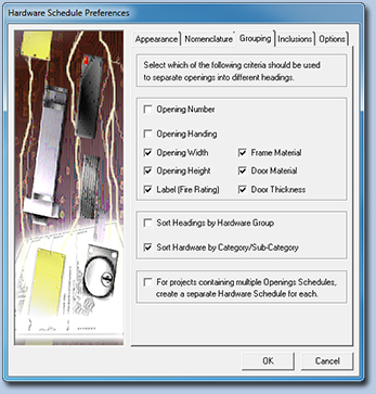 Based upon the “Grouping” options selected and standards set forth by the industry, the system can automatically sort the project’s openings and arrange them into headings. There are a number of opening attributes than can be optionally selected or deselected for consideration in the grouping process. Any attributes that are not selected are disregarded - effectively this means that a difference in that particular aspect of the opening will not cause the opening to be positioned in a separate heading.
