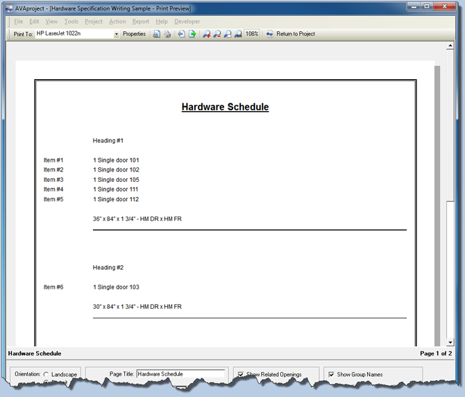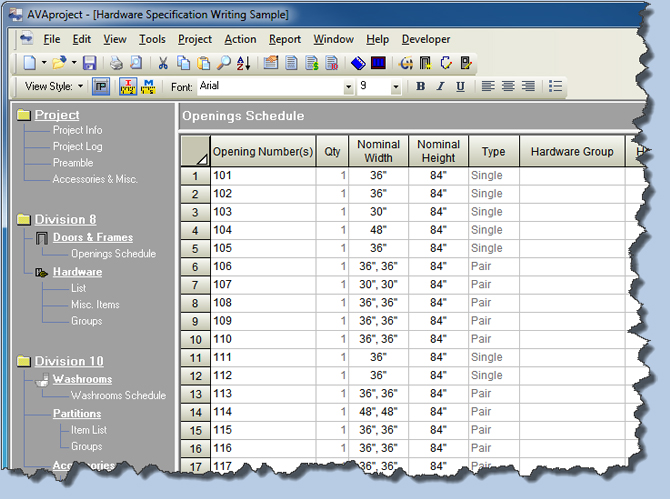 Once the take-off has been completed, a tremendous amount of the base information upon which the hardware schedule is built has already been entered. From the blueprints, the basic Openings Schedule complete with opening sizes, handing and fire labels forms the basis for the hardware specification. From there, the spec. writer can begin to assign hardware items to the openings.