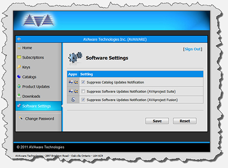 The Software Settings Options in the Customer Login Area of the AVAware Website