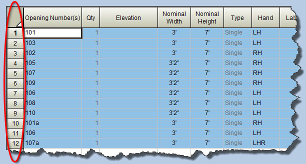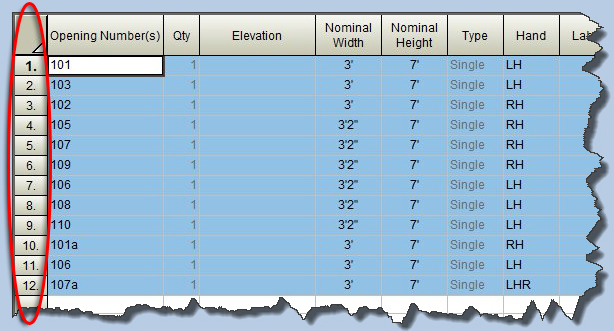 Typically, the Openings Schedule rows are numbered sequentially as shown below. (The numbers in the row headers are simply referred to as “row numbers”.)
