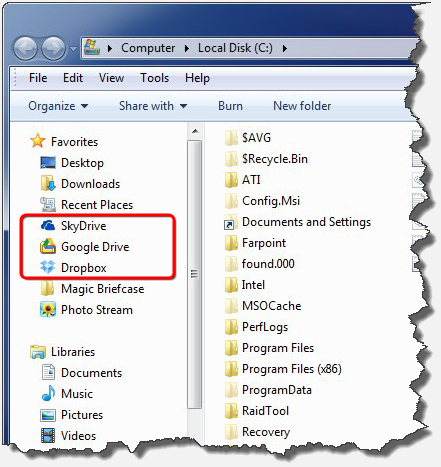 Microsoft SkyDrive, Google Drive and Dropbox. Each of these services makes available a free application that can be downloaded and installed on Windows PCs. Once installed, each one places a small icon in the “tray” area of the Windows desktop (normally the bottom-right corner).