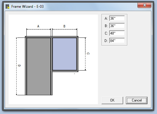 This powerful, yet often-ignored tool allows non-CAD users to import and quickly modify the dimensions of a standard frame elevation. Even though AVAcad is now bundled with every copy of AVAproject installed, the Frame Wizard still provides a simple alternative for quick, minor changes. Once an elevation has been imported into the Openings Schedule, simply click on the Frame Wizard icon ( Frame Wizard Icon ) (instead of AVAcad). Upon doing so, a screen similar to the following will be displayed. All dimensions are assigned a letter and listed to the right of the elevation. To change a dimension, simply change the number in the box next to the corresponding letter. The frame will be resized and redrawn immediately.