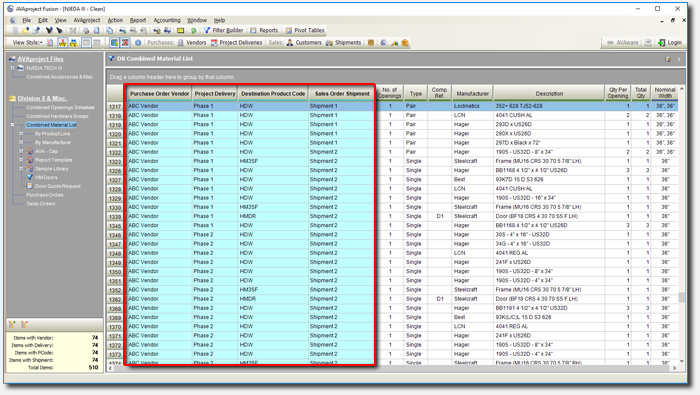 The AVAproject Fusion material sourcing columns. These columns, along with the Accounting Toolbar above, are enabled in the presence of one or more AVAproject Fusion Plugins for Accounting/ERP systems