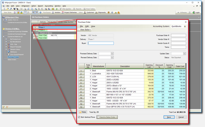 Meanwhile, AVAproject users are able to view the order status of all the products relating to a given opening right from the opening schedule. A convenient "popup" displays all the purchase and sales orders generated for each of the door, frame and hardware items.