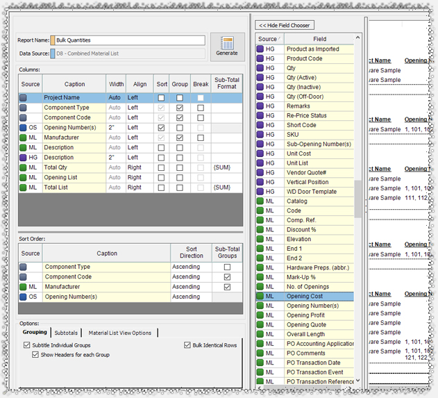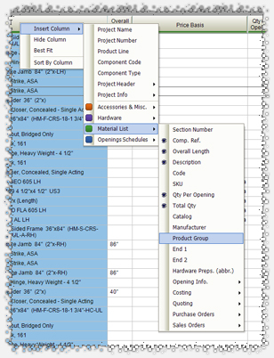 Users can browse this table in AVAproject Fusion using a familiar AVAproject interface. As always, columns can be inserted from the standard AVAproject library - but with a huge added feature. In addition to all the standard columns, all related data columns from the various source schedules are also offered. For any given line in the Material List, absolutely any column from the associated Hardware Groups and Openings Schedules can be added; thus making the options available for the creation of custom reports virtually limitless.