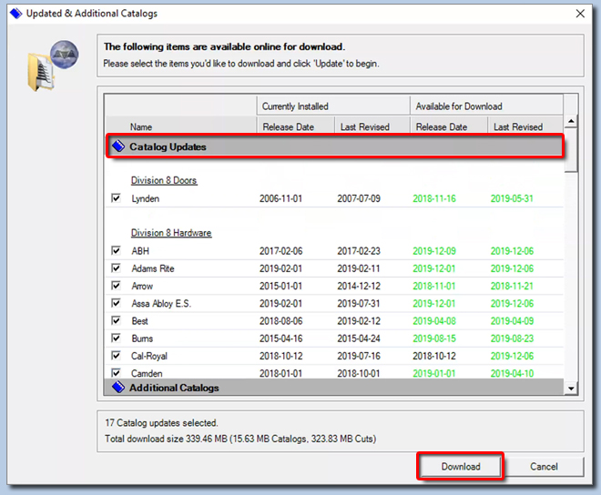 The Catalog Download dialog provides convenient access to the catalog library. Users are given an overview of how catalogs are organized and how to download them.