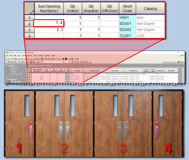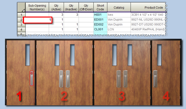 Additional sub-opening assignment can be added simply by separating their number designations with commas. To add the same exit device hardware to the rightmost leaf, simply add ", 4" to the "Sub-Opening Number" column. Meanwhile, the piece of hardware that was previously assigned to all the openings is now assigned to the remaining openings only - "2" and "3".