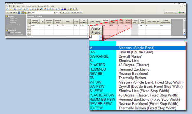 Profiles are specified in the Openings Schedule using a combination of the Frame Catalog, Frame Series and Profile columns. For each frame series, a list of available choices is offered in the Profile column.