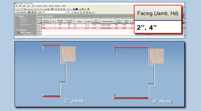 Values provided in other columns such as Jamb Depth, Facing, Door Thickness and Handing are used to further configure the profile for the specific opening. Profiles appearing in the Submittal Package are resized based on the Jamb Depth and Facing dimensions. The rabbet sizes are adjusted to accommodate the door thickness and positioned based on the swing direction of the door itself.