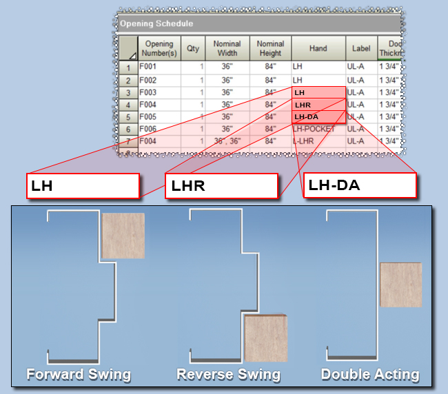 The handing of an opening can have a profound impact on the configuration of the frame profile, even changing it entirely. Switching from a 'forward' to a 'reverse' swing will cause the door to be positioned on the opposite side of the frame, resizing the rabbets as required. Whereas a 'double acting' swing will cause the stop to be removed entirely, effectively resulting in a 'cased-open' profile with the door positioned in the center of the jamb.
