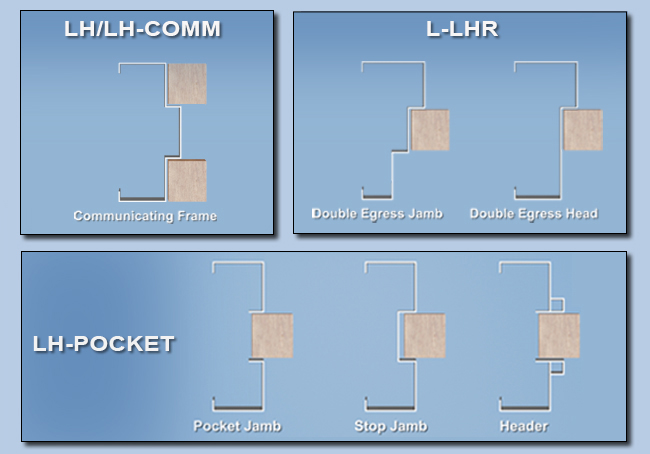 'Pocket frames' for which each jamb component is rendered separately, showing the receiving (or pocket) jamb, the stop jamb, and the header.