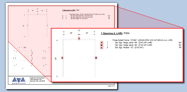 AVAproject Shop Drawings are automatically created for each scheduled opening, showing a rendering of both the frame and the related frame profiles. Each component is tagged with a letter that corresponds to a line on the associated Material List.